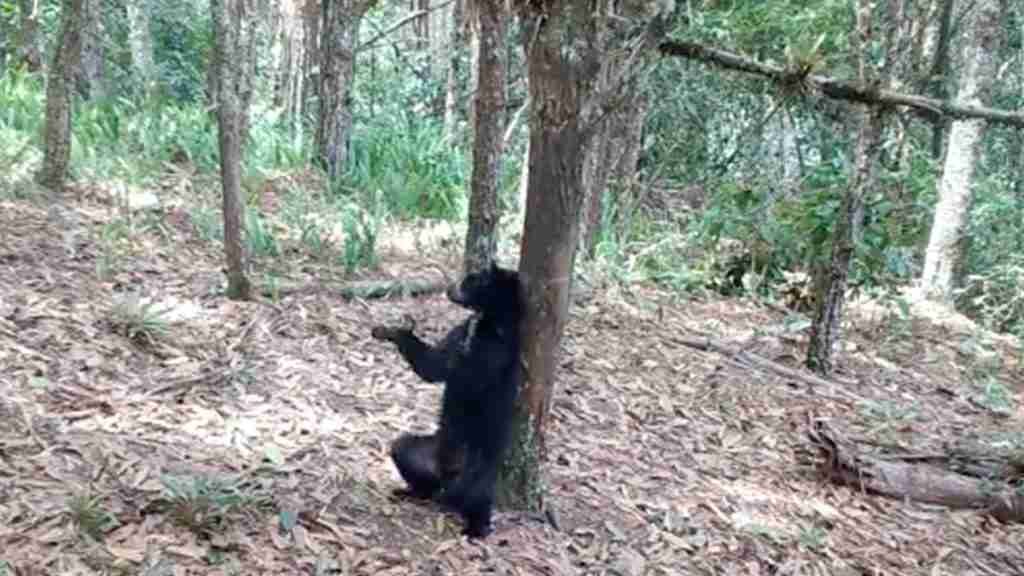 Cámaras trampa instaladas en el Parque Natural Nevado del Huila, registraron el momento en el que una cría de oso de anteojos se rasca contra un árbol, acción que es realizada con frecuencia por este tipo de mamíferos para desprenderse de pelo, piel muerta y parásitos.