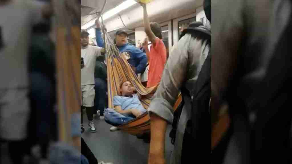 Ayer en el Metro de Medellín en plena hora pico, un hombre colgó una hamaca en uno de los vagones y se acostó en ella durante el recorrido.