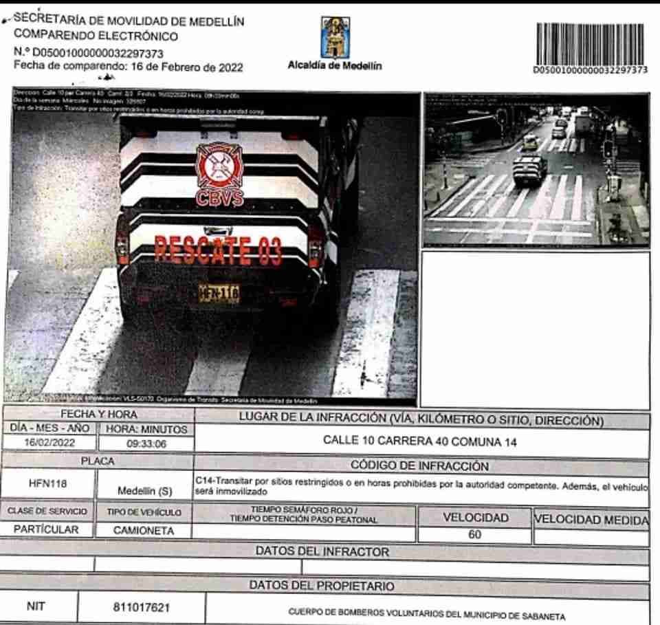 Cerca de 500 mil pesos de multa tendría que pagar un vehículo que pertenece a los Bomberos Voluntarios de Sabaneta, porque supuestamente violó el pico y placa cuando transitaba por una vía en El Poblado.