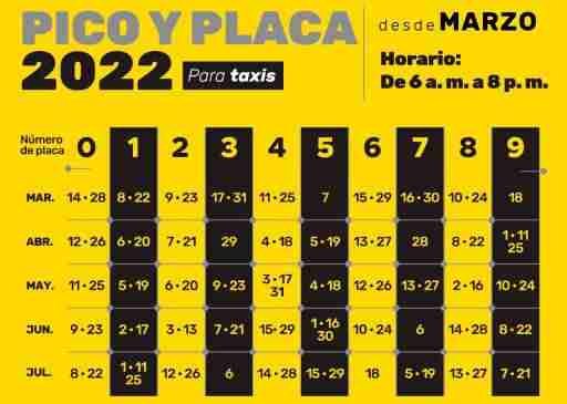 El pico y placa será una vez cada 15 días. Los taxistas podrán circular sin pasajeros, el mismo día del pico y placa, solo si requieren reparar el vehículo. La Secretaría de Movilidad indicó que es indispensable “instalar un aviso, con letra clara y tamaño visible en la parte trasera del taxi”, indicando que se realiza el mantenimiento.