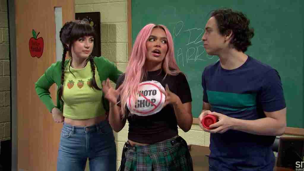 Además de poner a cantar en español a los asistentes en vivo, Karol G también participó en una de las escenas humorísticas del programa. En una puesta de escena sobre una clase de español, la cantante apareció al final, poniendo a cantar y bailar el alfabeto a los demás actores.