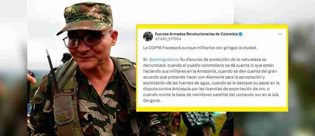 «La COP16 fracasará aunque militarice con gringos la ciudad. Sr. @petrogustavo: Su discurso de protección de la naturaleza se derrumbará cuando el pueblo colombiano se dé cuenta lo que están haciendo sus militares en la Amazonia, cuando se den cuenta del gran acuerdo que pretende hacer con Alemania para la apropiación y explotación de las fuentes de agua, cuando se le destape su papel en la disputa contra Antioquía por las licencias de exportación de oro, o cuando monte la base de monitoreo satelital del comando sur en la isla Gorgona»: Fuerzas Armadas Revolucionarias de Colombia.