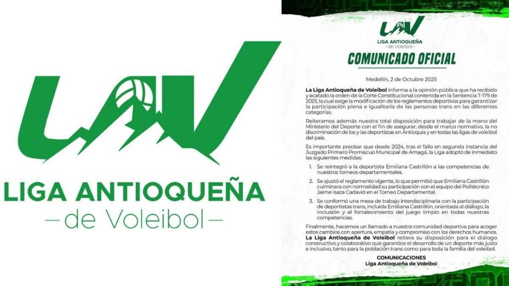 Este jueves 2 de octubre de 2025, desde Medellín, la Liga Antioqueña de Voleibol anunció que dará cumplimiento total a la Sentencia T-179 de 2025 emitida por la Corte Constitucional. La orden es clara: modificar sus reglamentos para garantizar la participación plena y sin discriminación de personas transgénero en todas las categorías del voleibol antioqueño.