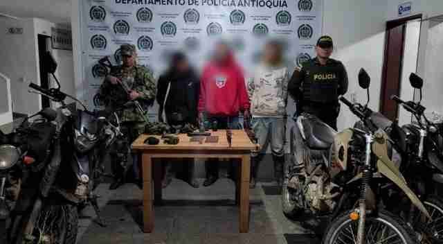 Al momento de su captura les fueron incautadas cuatro motocicletas, municiones y cargador para dos fusiles calibre 7.62 mm, una granada de fragmentación, quince cartuchos calibre 9 mm y un chaleco de uso privativo de las fuerzas militares.