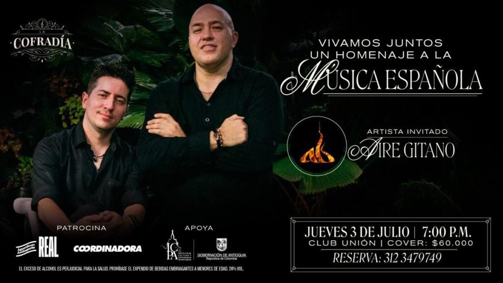 Hoy  miércoles 3 de julio de 2025, Medellín será sede de La Cofradía, una tertulia musical que fusiona música en vivo y relatos en un formato íntimo y participativo. El evento se realizará en el Club Unión desde las 7:00 p.m., invitando a los asistentes a disfrutar de una experiencia cultural diferente a un concierto tradicional.
