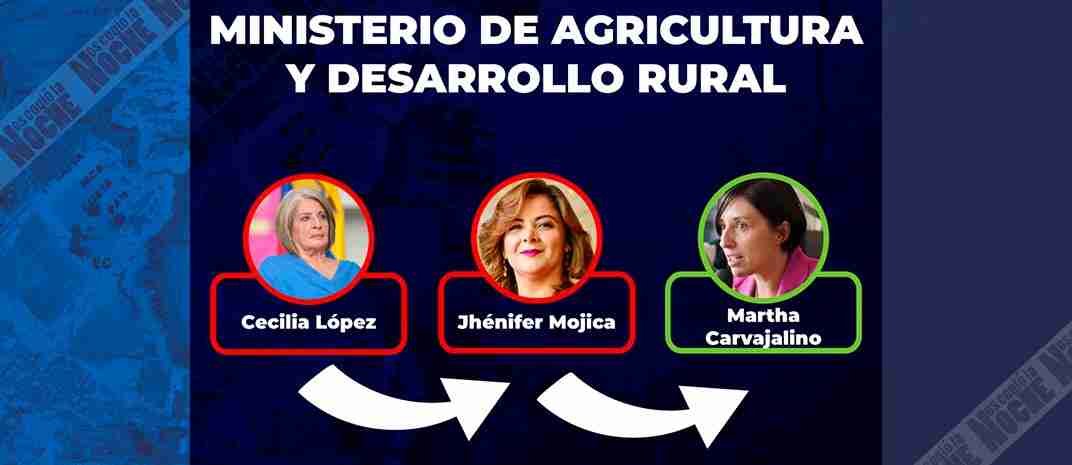 La excongresista, Cecilia López, lideró desde agosto del 2022, la cartera de Agricultura; allí estuvo hasta abril del 2023, donde en medio de la polémica por la gestión y presuntas diferencias con integrantes del Gobierno Nacional, presentó su carta de Renuncia y, en su reemplazo, el presidente Petro nombró a la abogada Jhénifer Mojica, quien un año más tarde, en julio 2024, salió de la cartera y fue reemplazada por Martha Carvajalino.