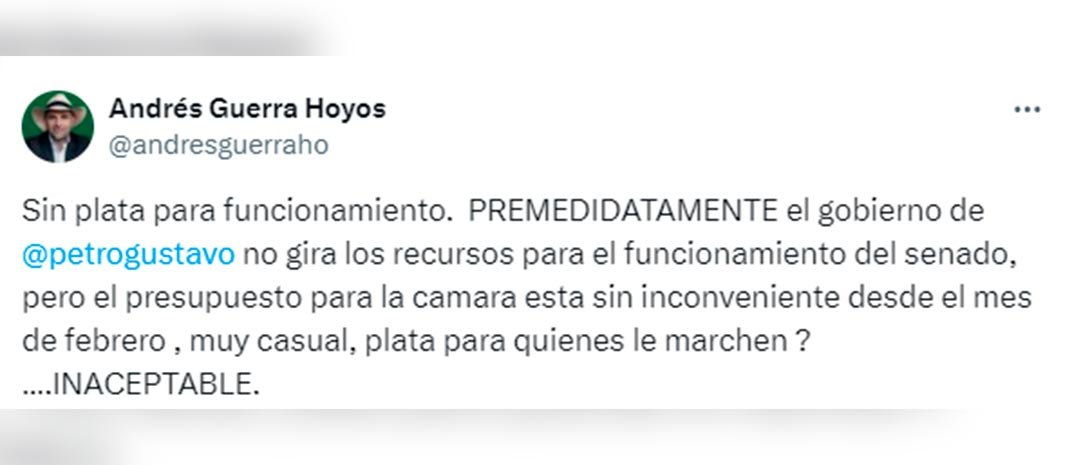 “Sin plata para funcionamiento. PREMEDIDATAMENTE el gobierno de Gustavo Petro no gira los recursos para el funcionamiento del senado, pero el presupuesto para la Cámara está sin inconveniente desde el mes de febrero, muy casual, ¿plata para quienes le marchen?”. Escribió el senador Guerra.
