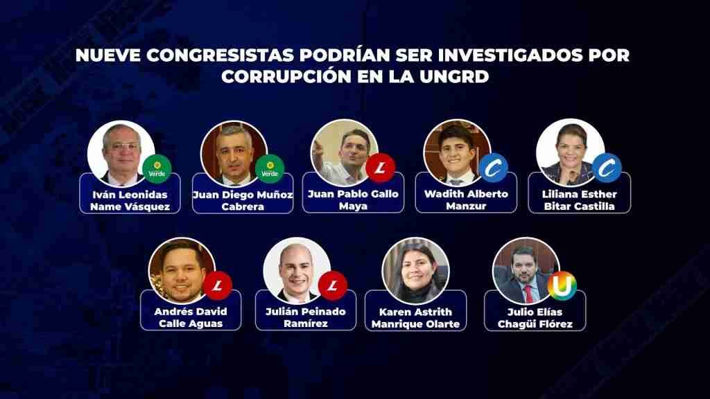 Además de los presidentes de ambas cámaras del Congreso, Iván Name y Andrés Calle, habría otros siete congresistas salpicados: Juan Diego Muñoz (Partido Verde), Wadith Manzur, Liliana Bitar (Partido Conservador), Julio Elías Chagüi (Partido de la U), Karen Manrique (curul de paz), Juan Pablo Gallo y Julián Peinado (Partido Liberal), este último de Envigado.