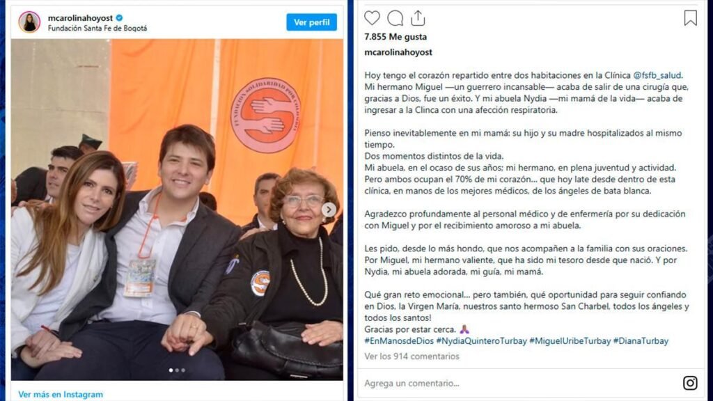 El anuncio llegó a través de María Carolina Hoyos Turbay, hermana del senador, quien señaló con pesar que aquella noche su corazón estaba dividido entre dos habitaciones. Por un lado, Miguel Uribe, un “guerrero incansable”, acababa de salir de una cirugía exitosa; por otro, su abuela, a sus 94 años, enfrentaba un cuadro clínico delicado bajo estricta observación médica. “Hoy tengo el corazón repartido entre dos habitaciones en la Fundación Santa Fe”, escribió la hermana, dando voz a la dualidad emocional que embarga a la familia.