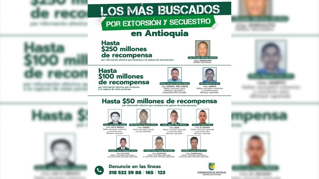 Entre los presuntos criminales acusados por extorsión y secuestro, se encuentran cabecillas de estructuras criminales como El Clan del Golfo, Disidencias de las FARC y delincuencia común organizada, por los cuales ofrecen una recompensa desde los 50 millones de pesos hasta los 250 millones, por información que conduzca a la captura de estas personas.