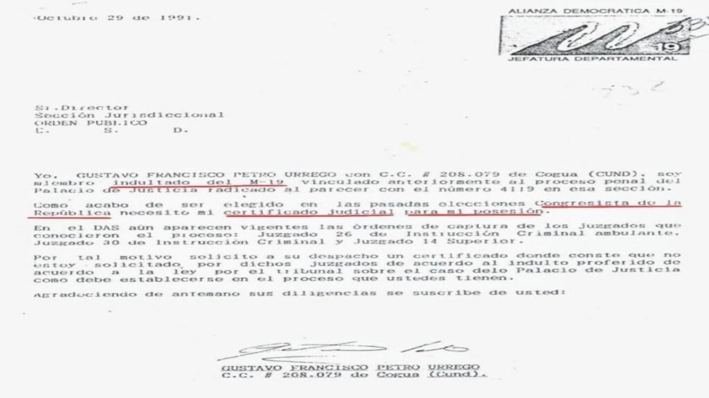 La controversia se gestó en las redes sociales cuando Petro afirmó: “No tengo indulto que renunciar, nunca lo recibí; estuve en la cárcel preso y no me dieron prisión domiciliaria, eso sí, me torturaron siete días.” Esa declaración fue el detonante. En respuesta, Uribe compartió una carta fechada en 1991, época en que Petro aspiraba a ingresar al Congreso. En ese documento, Petro se identifica como “miembro indultado del M-19” y solicita un certificado judicial donde se reconoce que las órdenes de captura en su contra estaban cubiertas por el indulto otorgado a los desmovilizados de ese grupo guerrillero.