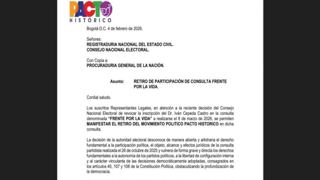 El movimiento político Pacto Histórico anunció oficialmente su retiro de la consulta interpartidista «Frente por la Vida», que estaba programada para el 8 de marzo de 2026. La decisión se tomó tras la revocatoria de la inscripción del precandidato Iván Cepeda Castro por parte del Consejo Nacional Electoral (CNE).