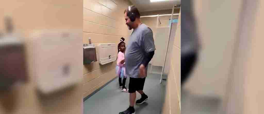 Con celular a la mano ingresa un padre a un baño público mientras graba a su hija, dudando de la seguridad de la menor al entrar sola e indefensa a un espacio público.