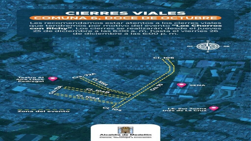 La Secretaría de Movilidad de Medellín autorizó cierres viales totales en el sector Pedregal, comuna 6 Doce de Octubre, desde las 6 de la mañana del jueves 25 de diciembre hasta las 6 de la tarde del viernes 26, para el montaje, desarrollo y desmontaje del evento “Los chorros con Richy” del artista urbano antioqueño Ryan Castro. La actividad contará con un aforo estimado de 500 personas y se llevará a cabo entre las 5 de la tarde del jueves y las 5 de la madrugada del viernes en las inmediaciones del SENA Pedregal.