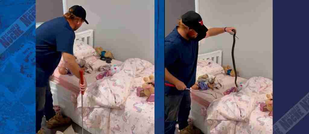 El reptil, identificado como una «serpiente negra de vientre rojo», altamente venenosa, fue avistado por los padres, quienes rápidamente llamaron a Snake Catchers Brisbane & Gold Coast para que se encargaran de la situación. Según las imágenes compartidas en Facebook por la empresa, el profesional utilizó una varilla especial curvada para mover a la serpiente cuidadosamente hacia la orilla de la cama, logrando llevarla al suelo sin incidentes. Posteriormente, la guio hacia una trampa de tela, permitiendo que el reptil ingresara de forma segura.