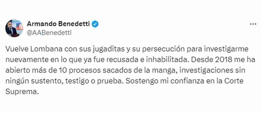 “Vuelve Lombana con sus jugaditas y su persecución para investigarme nuevamente en lo que ya fue recusada e inhabilitada. Desde 2018 me ha abierto más de 10 procesos sacados de la manga, investigaciones sin ningún sustento, testigo o prueba. Sostengo mi confianza en la Corte Suprema”. Escribió en su cuenta de X en la mañana de este viernes, 7 de junio.