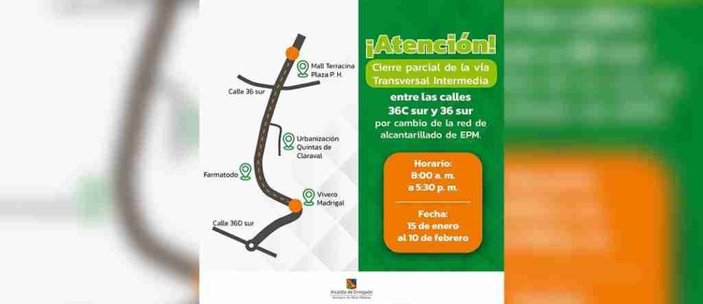 La Alcaldía de Envigado anunció que a partir del lunes 15 de enero, y hasta el 10 de febrero de 2024, se implementará el cierre parcial diurno de la Transversal Intermedia (carrera 27) entre las calles 36C Sur y 36 Sur, de 8:00 a. m. a 5:30 p. m., por el cambio de redes de Empresas Públicas de Medellín (EPM).