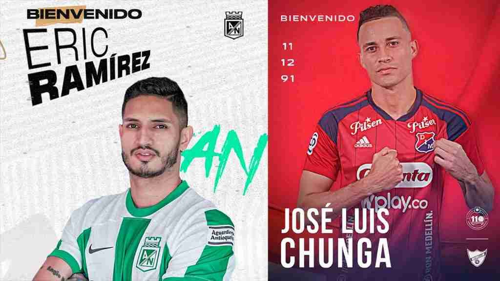 Los dos clubes de Medellín anunciaron a sus nuevos fichajes de manera casi simultánea: el Verdolaga oficializó la llegada del delantero venezolano Eric Ramírez, quien tendrá la responsabilidad de ser el hombre de los goles del equipo verde, y el Poderoso la contratación del portero barranquillero José Luis Chunga, que llega para reemplazar a Mosquera Marmolejo, quien se lesionó en un entrenamiento y se perderá el resto del semestre.