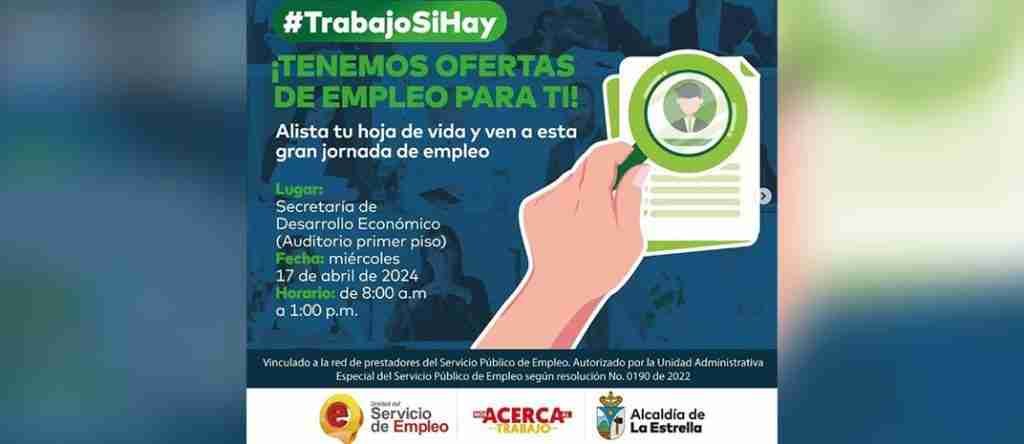 La Secretaría de Desarrollo Económico del municipio de La Estrella, realizará una gran jornada de empleo este miércoles 17 de abril entre las 8:00 a. m. y la 1:00 p. m.