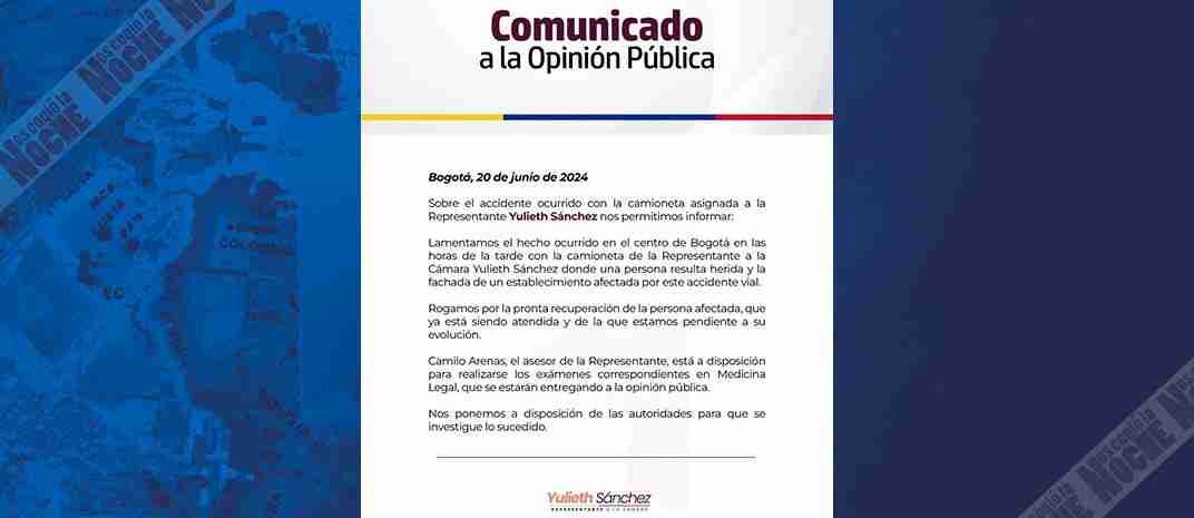 Yulieth Sánchez, representante a la Cámara de Representantes por el Centro Democrático, emitió un comunicado a la opinión pública con motivo del accidente de tránsito en el que se vio involucrado uno de sus asesores, mientras conducía el vehículo asignado a su esquema de seguridad.