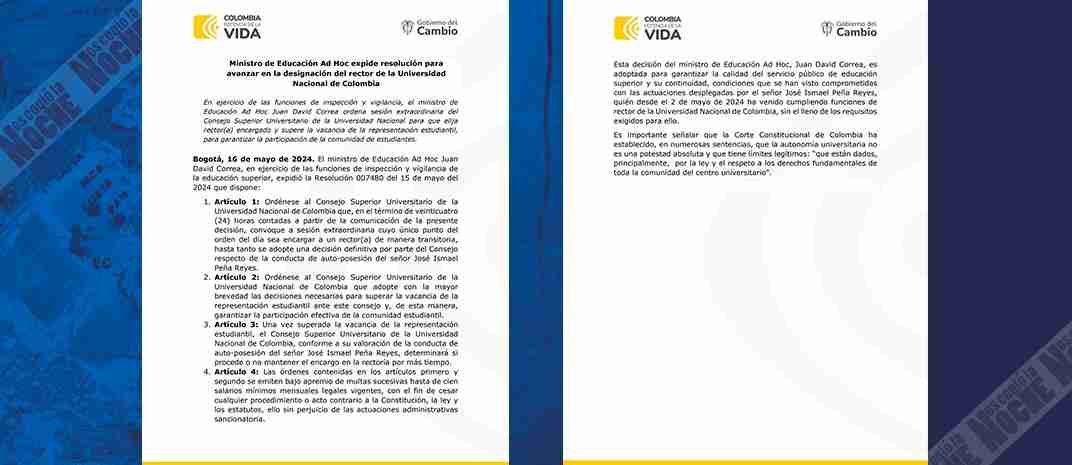 El ministro de Educación ad hoc, Juan David Correa, quien también es el ministro de Cultura, ha dado la instrucción al Consejo Superior Universitario de la Universidad Nacional, que adelante una sesión extraordinaria, que tenga como único propósito, dejar en encargo a un rector, transitoriamente, en tanto se resuelve el nombramiento y posesión de quien estará en esta dignidad.