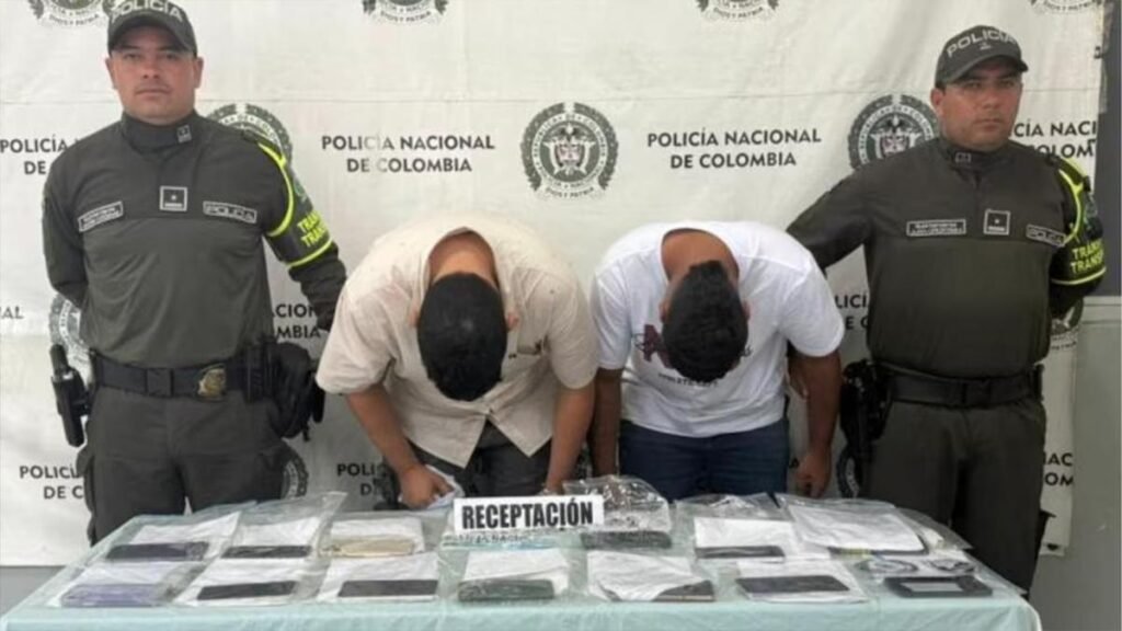 El procedimiento se efectuó cerca del peaje de Los Papiros en la Vía al Mar, donde agentes de la Seccional de Tránsito y Transporte detuvieron un vehículo sospechoso. En su interior encontraron 17 iPhone y 22 dispositivos Android. Los capturados fueron identificados como Jainer Berrío Garizábalo, de 22 años, y Víctor Gómez González, de 47, quienes no pudieron justificar la procedencia de los celulares.