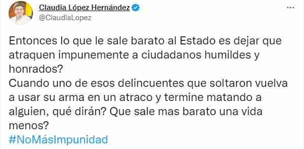 La alcaldesa mayor de Bogotá, Claudia López, continúa manifestando su insatisfacción con el sistema judicial colombiano, especialmente por los más recientes hechos que se presentaron en la capital del país, en donde un grupo de 13 extranjeros fueron capturados en flagrancia, hurtando, por la Policía Metropolitana de Bogotá, pero horas después fueron dejados libres por una jueza de control de garantías.