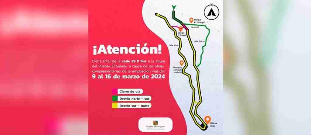 La Secretaría de Obras Públicas de Envigado informa a la comunidad que, del 9 al 16 de marzo de 2024, se llevará a cabo un cierre total de la calle 39 D Sur a la altura del Puente El Salado. Este cierre es necesario para avanzar en las obras complementarias del proyecto de ampliación vial.