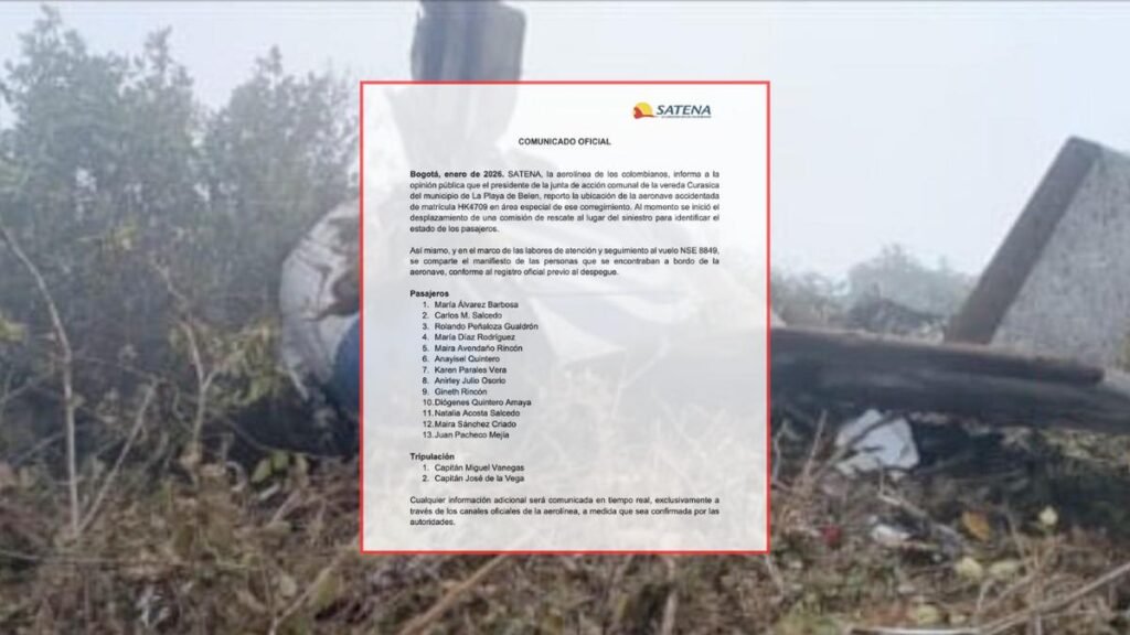 En las últimas horas, Satena confirmó la recuperación de su avioneta HK-4709, siniestrada en la vereda Curasica, municipio de La Playa de Belén, en Norte de Santander. El accidente dejó 15 víctimas fatales, entre pasajeros y tripulación, según reportaron las autoridades regionales y la Aeronáutica Civil.