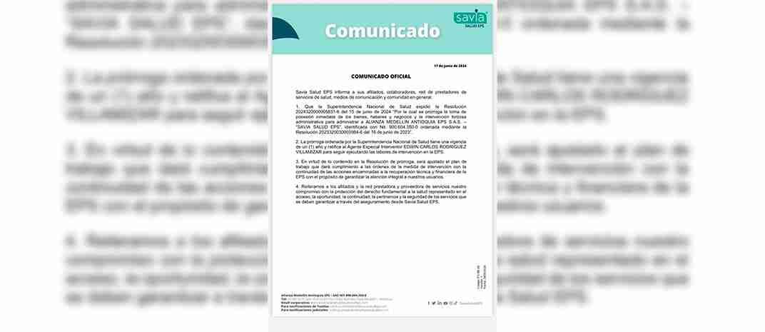 La EPS Savia Salud informó en un comunicado que la Superintendencia de Salud ha decidido extender la intervención de la entidad por un año más. Esta resolución, emitida el 15 de junio de 2024, ordena la prolongación de la toma de posesión inmediata de los bienes, haberes y negocios de Savia Salud EPS, asegurando la continuidad del control administrativo sobre la EPS.