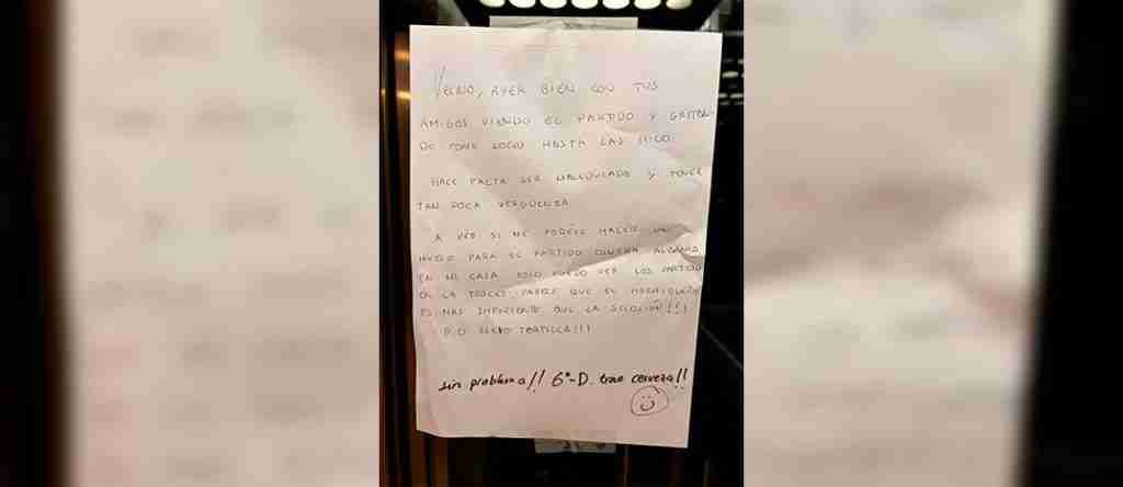 En un gesto que captó la atención de muchos en redes sociales, el vecino decidió colgar un cartel en el ascensor dirigido a sus ruidosos vecinos aficionados al fútbol. El mensaje comenzaba con una reprensión por la falta de consideración, pero sorprendió a todos al pedirles amablemente un espacio para un próximo partido: «a ver si me podéis hacer un hueco para el partido contra Albania. En mi casa solo puedo ver los partidos en la tablet… Posdata: llevo tortilla».