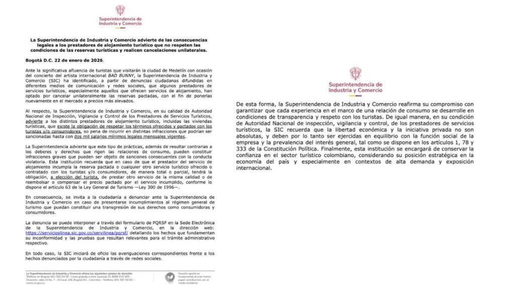 En Medellín, la Superintendencia de Industria y Comercio advirtió a los prestadores de servicios de hospedaje sobre las cancelaciones unilaterales de reservas detectadas antes de los conciertos de Bad Bunny, programados para el 23, 24 y 25 de enero de 2026, que afectan a numerosos usuarios.
