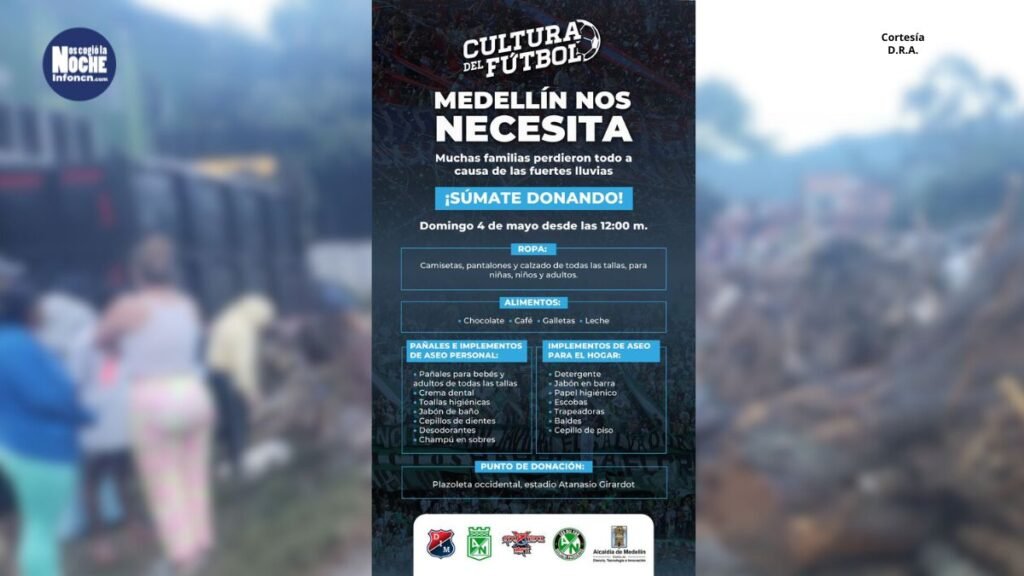 La Alcaldía de Medellín, en cabeza del alcalde Federico Gutiérrez, invita a los aficionados del fútbol que asistirán este domingo al estadio, para ver el flamante duelo entre Independiente Medellín y Atlético Nacional, a que donen elementos que ayuden a las familias que están pasando momentos difíciles en la capital antioqueña por cuenta de las intensas lluvias.