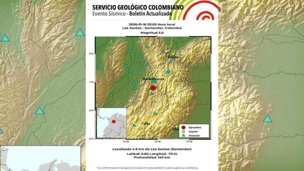 En la madrugada del viernes 16 de enero, un sismo con magnitud 5.0 tuvo su epicentro en el municipio de Los Santos, Santander, y fue sentido en Bogotá, Antioquia, Cundinamarca, Boyacá y otras regiones, sin reportes preliminares de daños o lesionados, según el Servicio Geológico Colombiano.