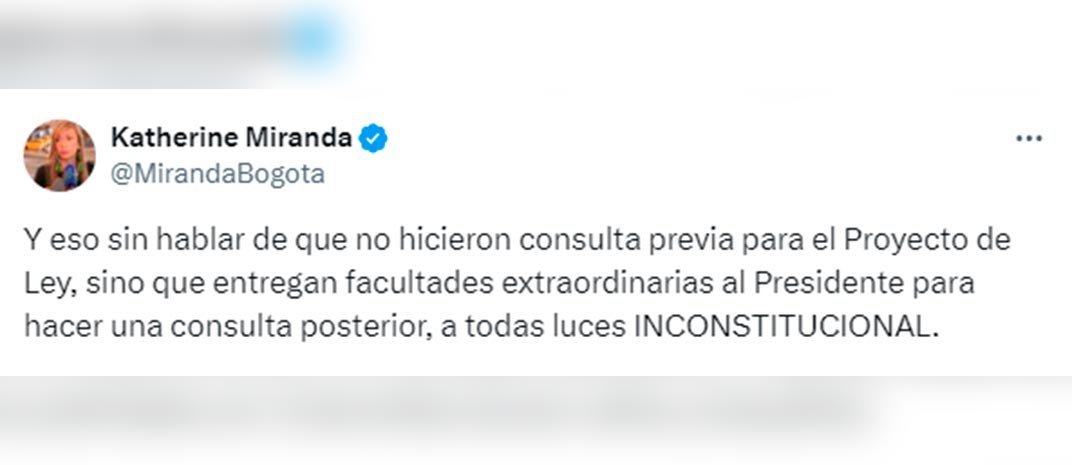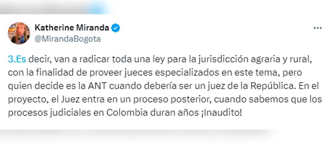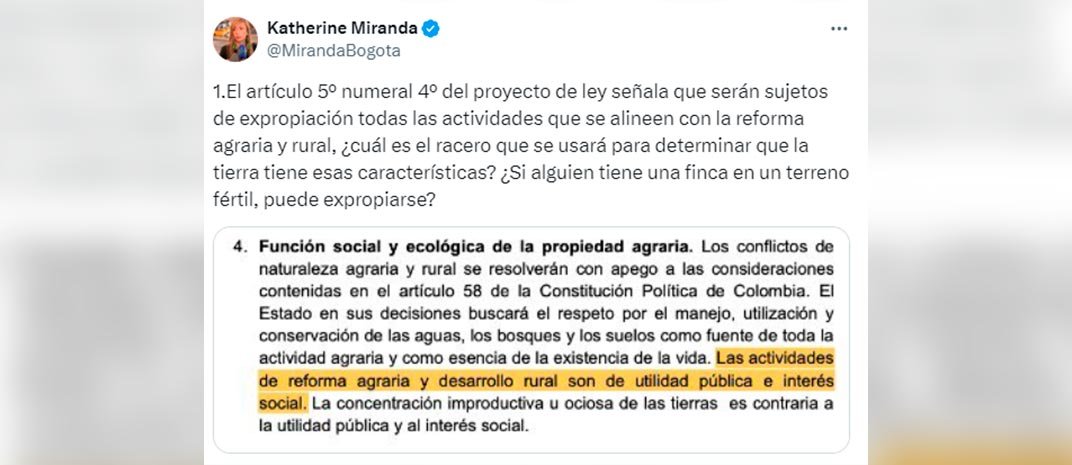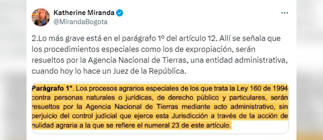 “Hoy se radica el proyecto de ley de Jurisdicción Agraria y Rural, y, tal como me lo temía, quieren incluir la expropiación exprés”. Con esas palabras, alertó la representante a la Cámara, Katherine Miranda, la intención que, según la congresista, tiene el Gobierno Nacional de promover este tipo de expropiación.