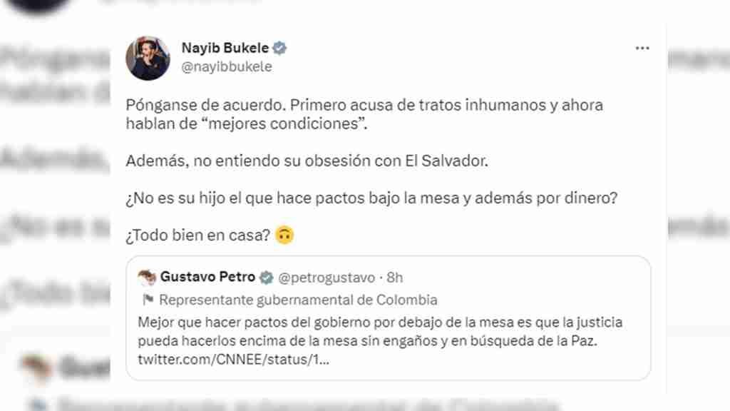 Por su parte, su homólogo salvadoreño, quien ha demostrado tanta o más pasión por la comunicación y la gobernanza a través de Twitter, no dudo en responder: Pónganse de acuerdo. Primero acusa de tratos inhumanos y ahora hablan de “mejores condiciones”. Además, no entiendo su obsesión con El Salvador. ¿No es su hijo el que hace pactos bajo la mesa y además por dinero? ¿Todo bien en casa?”