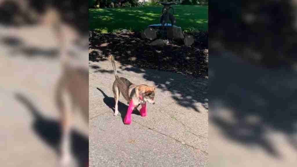 La que sería su cuidadora le pone sus nuevas prótesis, las ajusta a la perfección y sin ninguna limitación se observa como el perrito emprende su camino junto a otro canino.