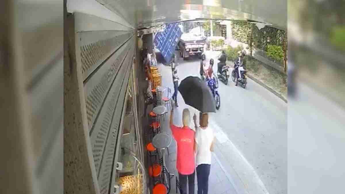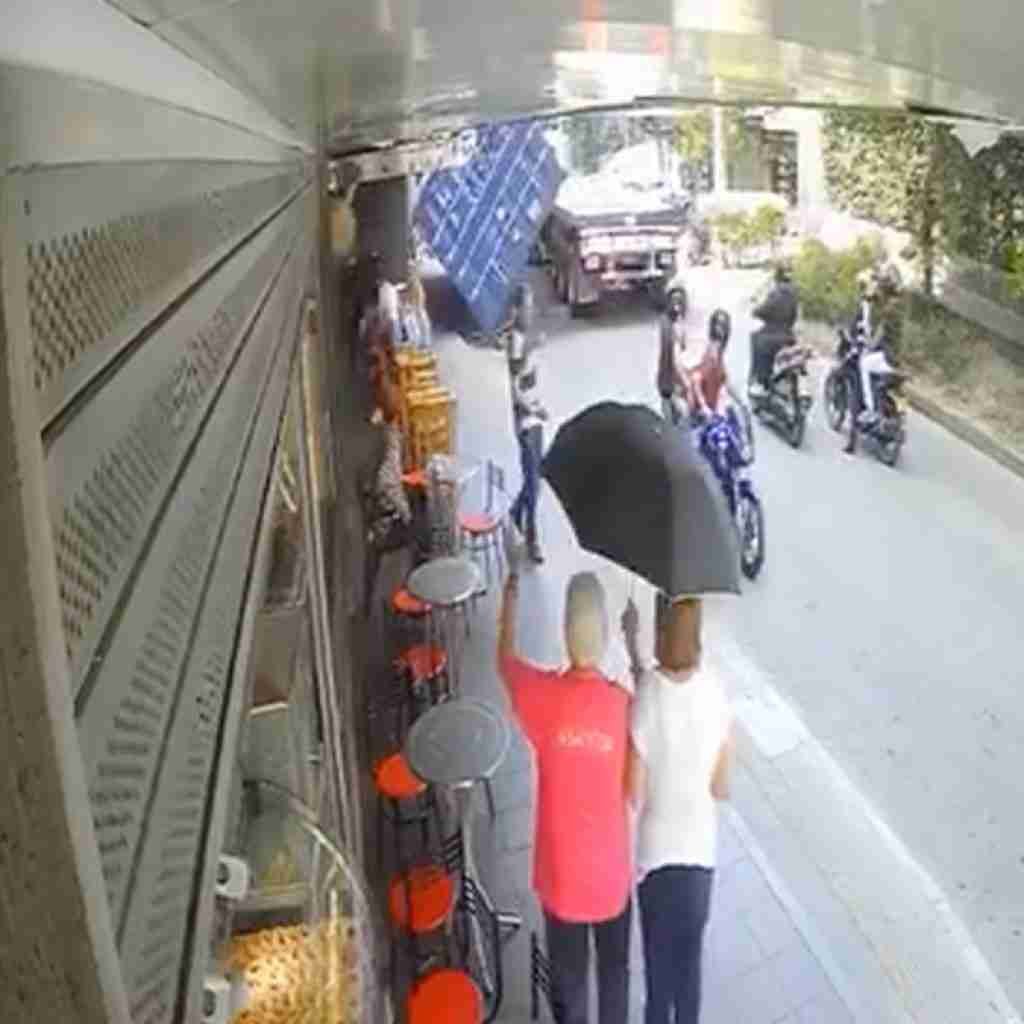 En el video se ve como los motociclistas segundos antes de que les caiga el contenedor de carga encima, se tiran de las motos y logran esquivar la muerte. El accidente solo dejó daños materiales y obligó al cierre de la vía mientras retiraban el container del lugar.