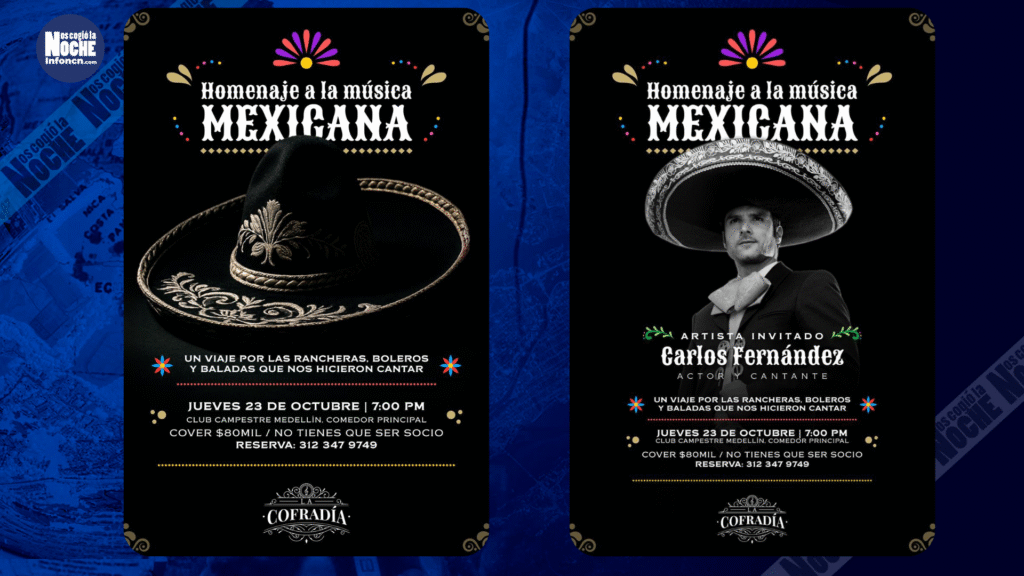El próximo 23 de octubre, el Club Campestre de Medellín se llenará de mariachis, nostalgia y romanticismo con una velada dedicada al sentimiento mexicano. Durante la noche se rendirá homenaje a grandes íconos de la música como José Alfredo Jiménez, Vicente Fernández, Luis Miguel y Rocío Dúrcal, entre otros artistas que han marcado generaciones con sus voces y letras inmortales.
